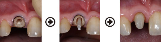 歯内療法をした後、グラスファイバー系のコア(土台)を入れました。利点として、歯根破折を起こしにくい、光の透過性が天然歯に近い、金属を使わないので歯肉に影ができないなど、美しく、自然な仕上がりとなります。