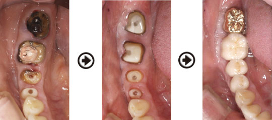 歯内療法、切除療法(FGG、歯肉強化)を行い、ファイバーコアを立てた後、適合の良いゴールドクラウンとオールセラミッククラウンを装着しております。